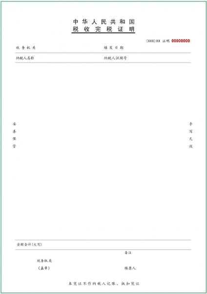 一、自2019年1月1日起,《税收完税证明》不再作为税收票证管理,不再套印“国家税务总局税收票证监制章”,加盖的税务机关印章由“征税专用章”调整为“业务专用章”。具体式样见附件。